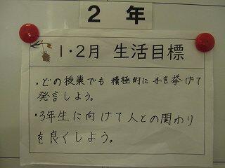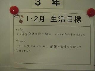 2つ目は、部活です。3学期は、冬休み明けに大会があります。その大会が終わると次の大会が私にとって、最後の大会になります。1つ1つの練習を集中して行い、声かけを大切にして励まし合っていきたいです。点を取れるようなサーブを打つことを目標にがんばりたいです。