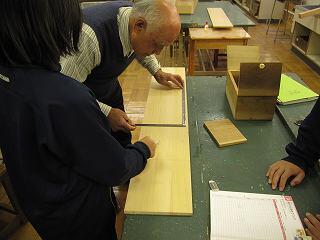 生徒は、大工さんでもある木工ボランティアの先生の技に感動していました。
