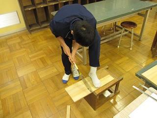 地域の木工ボランティアの方にご指導いただいて、生徒たちが考えた設計図をもとに、けがきやのこぎり引きを行いました。
