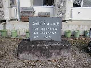 石碑には、加蘇中学校の北緯と東経、海抜などが刻まれています。