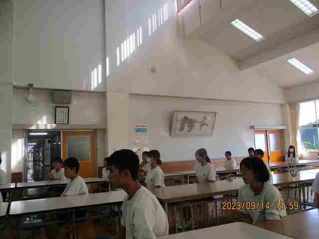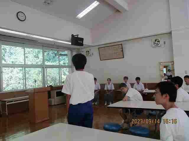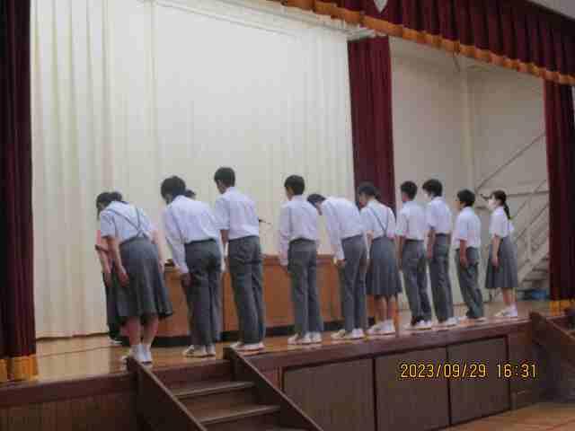 校長先生からは、1・2年生に向けては、3年生からバトンを受けて、緊張とともによしやるぞという気持ちが感じられること、メンバーでたくさんの話をしてよりよい方向を目指していってほしいこと、3年生に向けては、これまで学校の顔になれるようにとの話をしてきた。本当によくやってくれた、バトンを渡してほっとしているのでは?(3年生のうなずきに対して)ほっとしてください。ほっとしていいから、残り半分の3年生としての学校生活でよい思い出を作ってほしい。などのお話がありました。