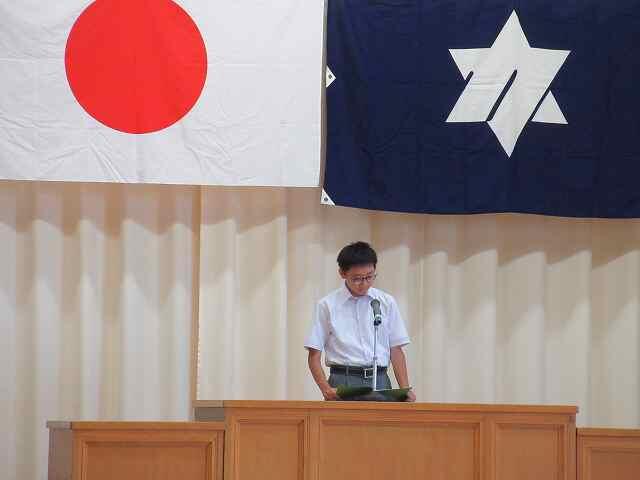 1年生の代表者からは、「定期テストや実力テストに向けて計画的に勉強したい」、「自然生活体験学習に向けて学級で考えたスローガン『一致団結』のもと、協力しながら自分たちで考えて行動していきたい』、「学校祭に向けて、1学期の2・3年生のがんばる姿をみて、2学期は少しでも力になれるように精一杯取り組んでいきたい」などの発表がありました。