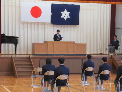 学校式辞では、本校の教育目標である「思いやりのある生徒」「自ら学ぶ生徒」「たくましい生徒」についてに関連して、自分自身は自分自身でしか伸ばせない。自分のことは自分で決めることができるようになってほしいとのお話がありました。また、目指す生徒像の「自ら考え判断し行動する生徒」について、自分で目標を設定して、それに向かって努力してほしい。自分のことだけでなく、全体のことを考え、失敗を恐れず行動してほしい。失敗は自分を成長させてくれる。そして、成長に欠かせないのは謙虚な心であるとの言葉をいただきました。