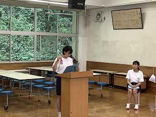4月からこの学校に赴任して、初日から誰もが大きな声であいさつをしてくれました。とてもすがすがしく、いつも学校に来るのが楽しみです。今年度から、44日間という長い夏休みになります。計画に基づき充実した夏休みにするためにも、健康に留意し、事件事故に合わない、熱中症や水の事故などに気をつけて生活してください。そして、2学期の始業式に全員が元気に登校してください。