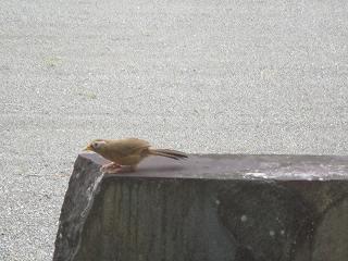 けたたましい鳴き声で、野鳥の群れが、石碑や花壇の間を散策しています。