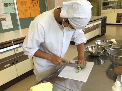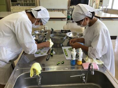 2年生家庭科調理の授業で、キュウリの輪切り実習がありました。生徒2名が30秒間で何枚切れるかを挑戦し、2人ともに19枚の記録でした。使用したキュウリは、2年生が実習後に、おいしくいただきました。