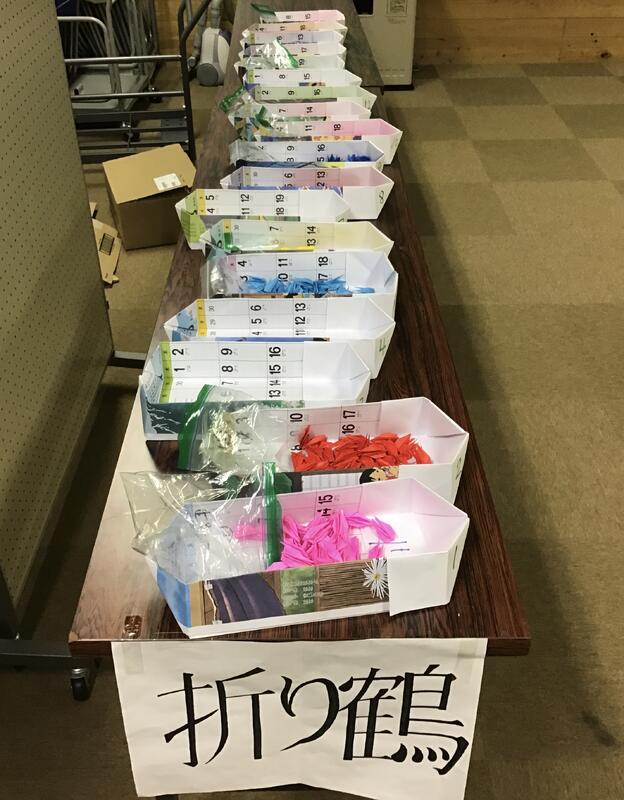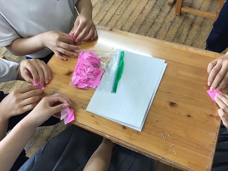 毎年8月に広島で開催されている「広島平和記念式典」に向けて、千羽鶴づくりが順調に進められています。本校生徒会が掲げた1000羽の完成に向けて、2年生が200枚、3年生が700枚、教職員が100枚を折る予定です。休み時間等を使って熱心に折り進めています。色とりどりの折り紙に、生徒1人1人の様々な気持ちが込められていきます。これから完成に向けて、ひと折り・ひと折り、ていねいに進めていきます。加蘇中学校だからできることを、加蘇中学校らしく頑張っていきます。