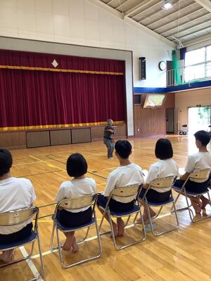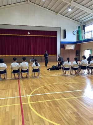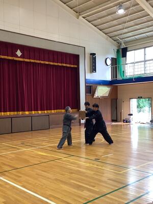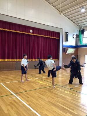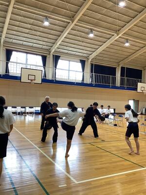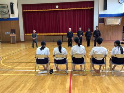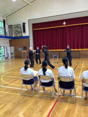 6月24日(火)に、正伝鹿沼 加園道場の山田照明 様(九段範士)、神山茂男 様(八段範士)、渡邉秀太 様(六段教士)、高橋直人 様(六段教士)、渡邉泰生 様(六段教士)の5名の皆様をお迎えし、演武を披露していただきました。会場となった体育館は、静寂の中、緊張感でいっぱいでした。1つ1つの体の動きや技に、想像できないほどの力がこもっているのが感じられました。間近で迫力のある演武を見られたことは、大変貴重な経験でした。最後には、生徒たちも1人1人、ミット打ち体験をさせていただきました。