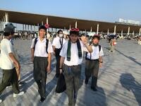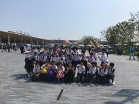 1年1、2組が出発式を行い学校を出発し。