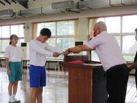 校長式辞では、写真を見ながらこの1年間の活動や行事について振り返り、1,2年生に対して、後輩から尊敬される先輩を目指して、『誰もが安心して楽しく生活できる学校』のために、『少しの我慢、少しの気配り、少しの努力』をのメッセージが送られました。
