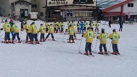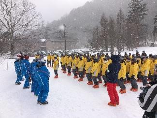 日光湯元スキー場の天気は晴れ。インストラクターの先生方にあいさつをして、いよいよスキー教室が始まりました。