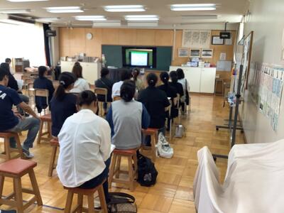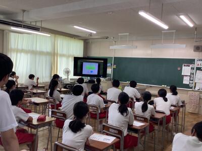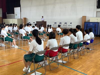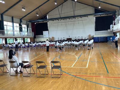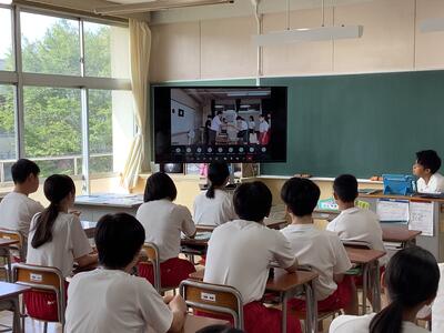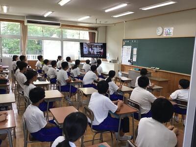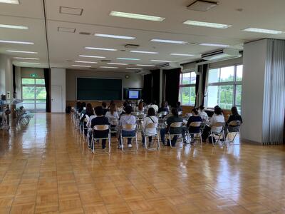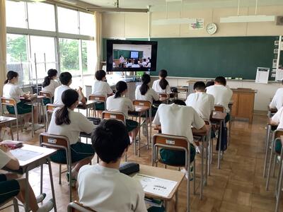 熱中症予防の観点から生徒は各教室で、保護者の方々は学年毎に分かれてエアコンのある部屋でZOOM配信による実施となりました。
