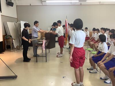 午前中は通常授業があり、午後は受賞伝達、生徒会任命式、終業式、通信表配布という流れの1日でした。校長先生からは、ノーベル化学賞を受賞した北川進京都大特別教授が記者会見で引用したパスツールの言葉「幸運は準備された心に宿る」の「準備」についてお話がありました。失敗をした時に何かのせいにせず、自分の強みと弱みが何なのかを振り返る事が大切だというお話でした。