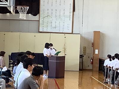 2年生の代表生徒が「1学期の反省」の中で、実行することの大切さなどを発表しました。校長先生からは「振り返り」と「反省」の違いや、ポジティブな考え方の大切さなどのお話がありました。