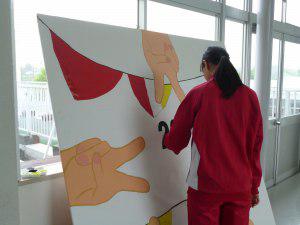 美術部では、6月10日(土)に開催される平成29年度北犬飼中学校運動会の看板を作成中です。今年度はピースサインで描かれた五角形のモチーフに赤、白、黄色組の三色の旗を背景にしたデザインに決定いたしました。運動会当日、校舎壁面に掲示されますので、どうぞ、ご覧ください。
