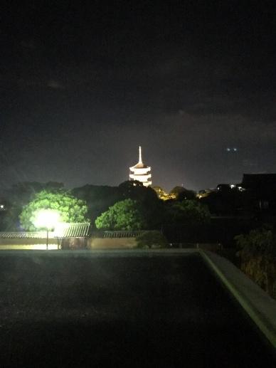 ホテルからはライトアップされた東寺が見えます。絶景を見ながら一日目を終えます。