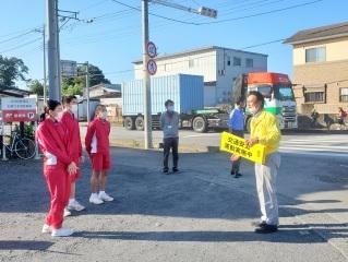本校の通学路である北犬飼郵便局交差点で交通安全の呼びかけを行いました。