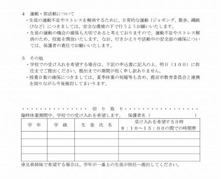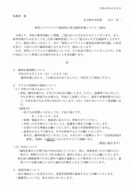 4 修了式はありませんが、北犬飼中学校の臨時登校日を設けます。日時については