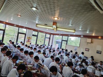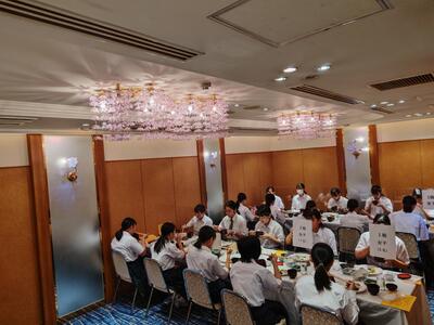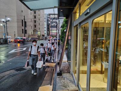 2日目。朝の検温も全員、無事に合格しました。健康面、バッチリです。本日は班別活動です。タクシー会社の朝礼を見学させていただいて、いよいよ出発です!