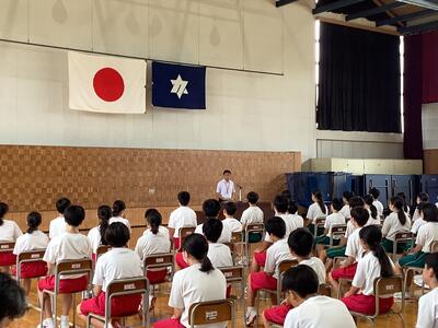 2年生の代表生徒が「1学期の反省」の中で、実行することの大切さなどを発表しました。校長先生からは「振り返り」と「反省」の違いや、ポジティブな考え方の大切さなどのお話がありました。
