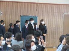 新任式では、転任された11名の先生方の紹介が行われました。生徒の皆さんは、先生方ひとりひとりの言葉を真剣に聞いていました。