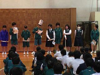 22日土曜日に行われる地区駅伝大会に向けての壮行会と、保健委員、美化委員が担当での生徒集会が行われました。日々厳しい練習に耐え抜いてきた駅伝部の生徒には、大会で努力の成果を発揮して、1秒でも速く、襷を繋いでほしいと思います。保健委員からは手洗いの仕方についての説明、美化委員会からは箒の歴史や、正しい使い方の説明などがありました。どちらも参考になるアドバイスなので、実践していきたいものです。