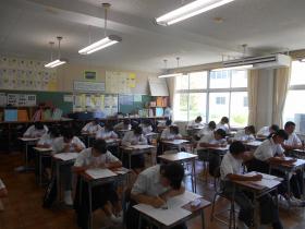 8月27日(月)、28日(火)の2日間で、3年生を対象に第3回実力テストが行われました。新学期が始まってすぐのテストでしたが、生徒の皆さんは一生懸命問題と向き合っていました。夏休み中にあった高校一日体験を通して、受験生としての意識も高まり、行動が変わってきたように見えます。