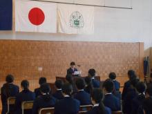 受賞伝達式の後、修了式が行われました。式辞では、平成30年度の学習が修了したこと、そしてこれからの北犬飼中学校を背負っていく生徒として必要なことを話していただきました。