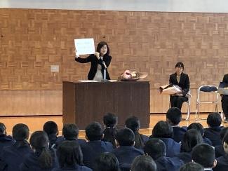 謝恩の会では、3年生の代表生徒が先生方に感謝の気持ちを伝え、記念品が贈られました。