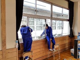 女子は、卒業証書用のリボンを結んだり、食堂や多目的室の清掃を行ったりしました。