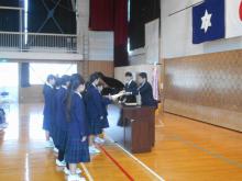 謝恩の会では、3年生の代表生徒が先生方に感謝の気持ちを伝え、記念品が贈られました。