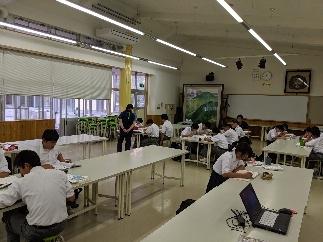前半は、成長期の中学生に必要な栄養素や食事摂取基準、給食との関係などについて、後半は、食品成分表を用いて、食品に含まれる栄養素についてを、実物を見せながら分かりやすく講話していただきました。