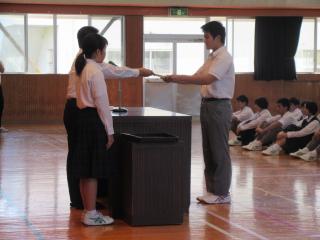 新生徒会役員、後期学級委員長、後期委員会委員長副委員長の呼名を行い、代表生徒が任命書を受け取りました。ひとりひとりが呼名に対してしっかりと返事をしていました。任命書を渡した校長先生からは、対話や話し合いで、よいアイディアが生まれる。全員の力で自分たちの学校を創っていこうという話がありました。バトンを引き継いだ生徒の皆さんを中心に、これからの北犬飼中学校をよりよい学校にしてほしいと思います。