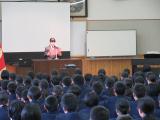 校長先生の話や、生徒会役員からの質疑応答では、中学校のきまりや学習などについて一生懸命メモをとっていました。その後、中学校の授業の様子を参観しました。授業を受けている中学生の様子を真剣な表情で見学していました。