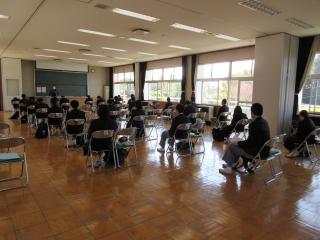 新型コロナウィルス感染拡大を防止するために、学年ごとに登校時間をずらし、場所も食堂、体育館、多目的室の3ヶ所に変更して対応しました。