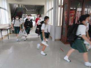 本日の訓練は、火災を想定した訓練で、各教室から避難する形式でした。荷物を持っての避難でしたが、「おかしも」を守り、速やかに避難しようと行動していました。