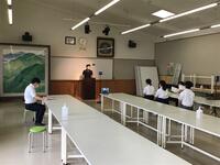 令和4年7月11日(月) 本校の食堂を会場に、放課後の子供たちの居場所となる「スマイルルーム」という活動を、地域の皆様が長年行っています。本日は、代表の谷中様が来校されて、生徒たちに今年度第1回の開催予定日や内容、申し込みについて説明してくださいました。