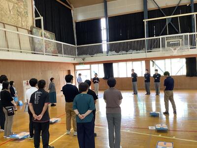 本校では毎年恒例のもので、心肺蘇生の方法、AEDの使用方法、気道異物除去法、エピペンの使用法、を学びました。また、部活動中に生徒が倒れたという想定で、実際の訓練も行いました。