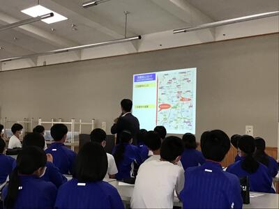 旅行会社の方から、京都市の特徴や文化、有名な寺社仏閣などを紹介していただきました。これから班別研修のコースを決めるにあたって、有意義なお話を伺うことができました。