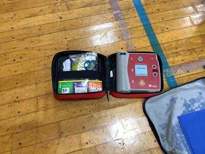 本校では毎年恒例のもので、心肺蘇生の方法、AEDの使用方法、気道異物除去法、エピペンの使用法、を学びました。また、部活動中に生徒が倒れたという想定で、実際の訓練も行いました。