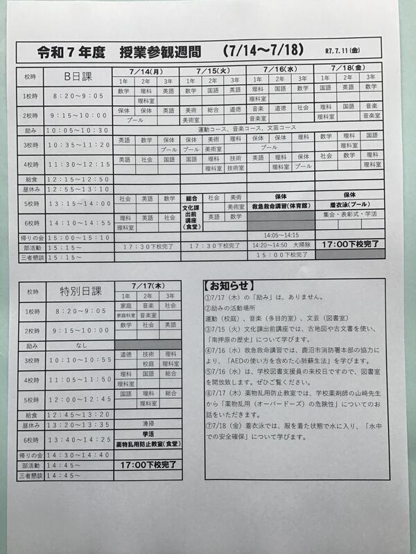 7/14(月)~18(金)は、授業参観週間です。今回は、保護者の皆様、ご家族様、地域の皆様も参観できるよう準備しました。図書室の開放や各種行事もございます。ぜひ、ご来校ください。