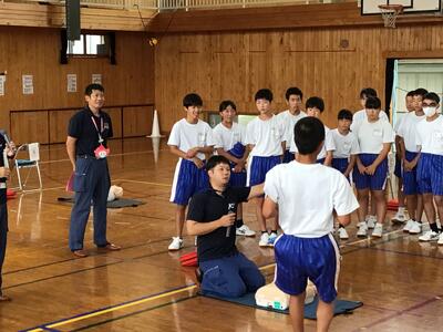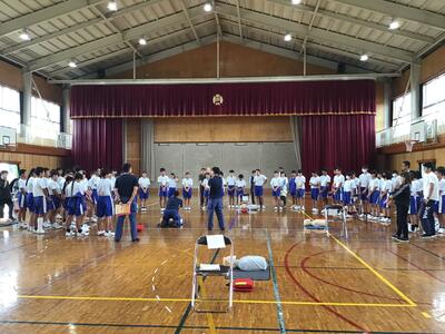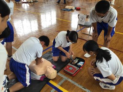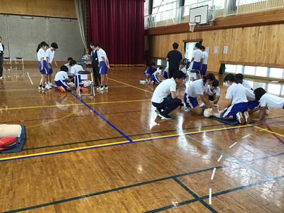 5校時に、鹿沼市東分署のご協力により、救急救命講習を行いました。昨年学んだ2、3年生が1年生に教えるなど、縦割り班で協力しながら、胸骨圧迫の注意点やAEDの使い方を学びました。