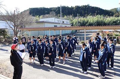 代表生徒の発表、委員会からのお知らせ、表彰伝達、校長からの講話、生徒指導主事からの講話、校歌斉唱等、冬休みを前のけじめの時間となりました。