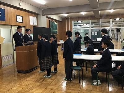 代表生徒の発表、委員会からのお知らせ、表彰伝達、校長からの講話、生徒指導主事からの講話、校歌斉唱等、冬休みを前のけじめの時間となりました。