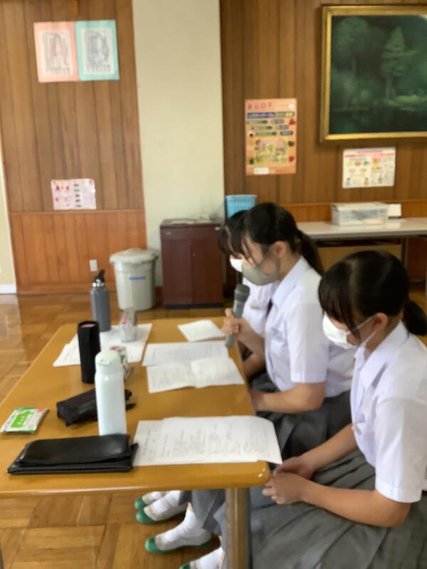 委員たちからの「平和についての意識を高め、一人一人が願いを込めて作りましょう」という千羽鶴作りの提案に、大きくうなずく生徒たちの姿でした。休み時間等を使って、みんなで協力して作り上げる予定です。
